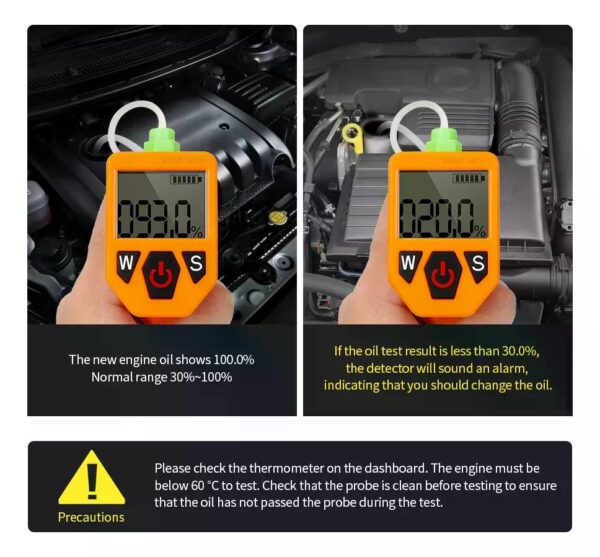 * PRODUCTO DISPONIBLE ENTREGA INMEDIATA *——————————————————————————————AVISO IMPORTANTE:La temperatura del aceite debe serInferior a 60 grados¡Durante la prueba! De lo contrario, la sonda del probador de aceite se romperá y no se puede reparar.* Tenga en cuenta que las Pilas no vienen en el paquete.**Características del probador de aceite de motor:Mini portátil, sin necesidad de sacar el aceite, medición precisa, prolonga la vida útil del coche.Detección de arranque con un botón, mayor precisión.La pantalla de visualización LED puede mostrar con precisión los resultados, lecturas más claras.Utilice el principio óptico para comprobar el estado del aceite del motor y obtener el último estado de su aceite en cualquier momento y en cualquier lugar.Con la sonda óptica, no es necesario sacar el aceite afuera, simplemente Coloque la sonda en la varilla de aceite para obtener los resultados de la prueba.Principio: ópticaEfecto: detecta el nivel de contaminación del aceite en el coche y calcula si necesita ser sustituido. El aceite debe ser sustituido en función de la conducción de 5000 kilómetros actualmente, pero el nuevo y el viejo Grado de coches, los diferentes hábitos de los conductores afectarán la vida útil del aceite del motor. El producto utiliza el principio óptico para detectar el aceite y determinar con precisión la situación de contaminación del aceite.