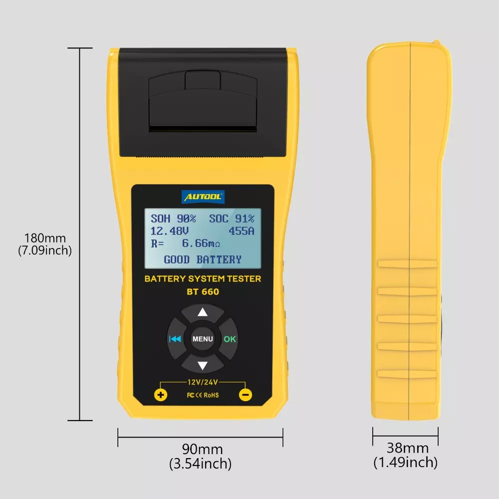 Con impresora se utiliza para baterías de arranque de plomo-ácido, inundadas regulares, placa plana AGM, espiral AGM, GEL y EFB. Al aplicar la tecnología avanzada de prueba de conductancia y la impresora térmica incorporada, BT660 puede brindarle resultados de prueba precisos e imprimirlos en segundos.
