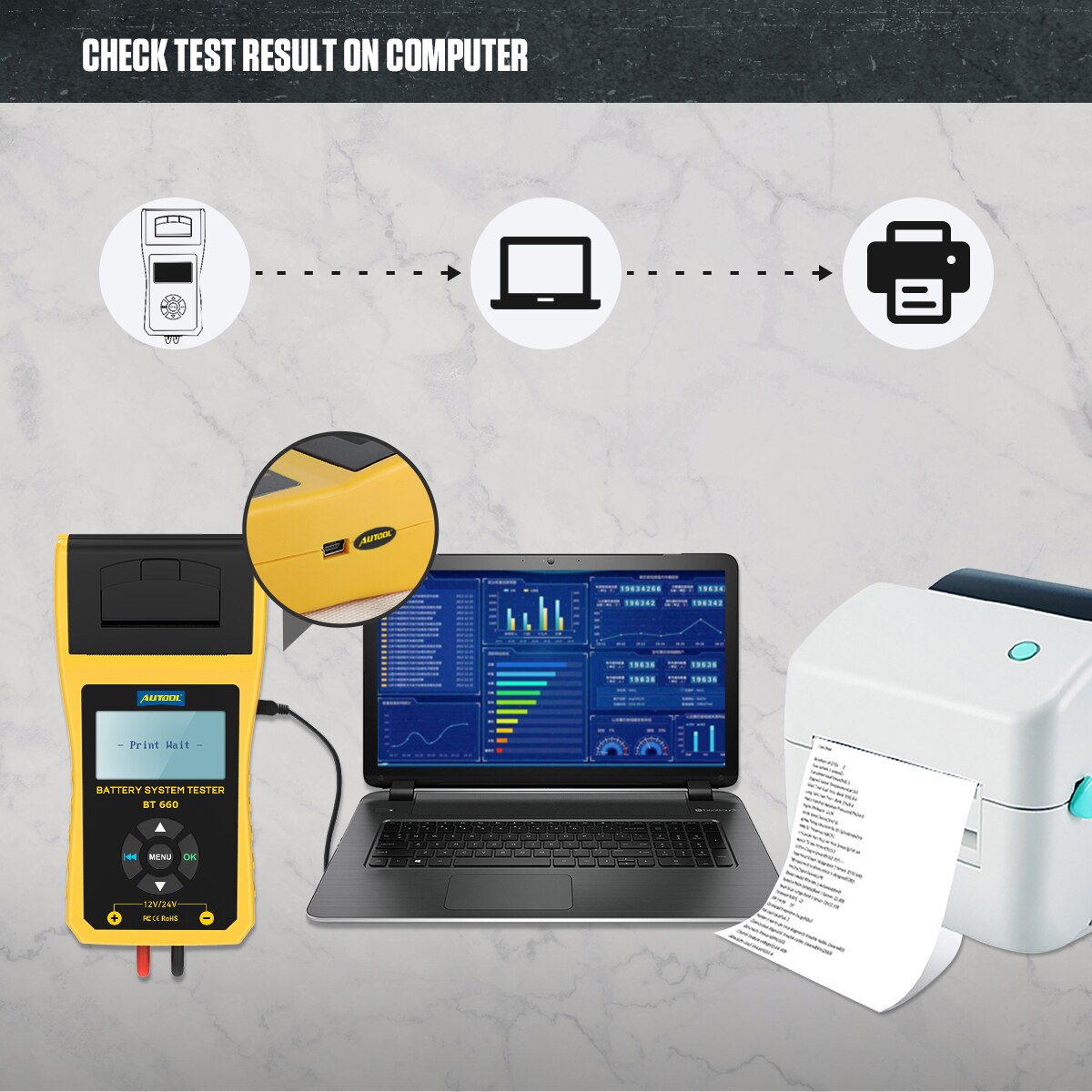 El probador de carga de batería de automóvil AUTOOL BT660 con impresora se utiliza para baterías de arranque de plomo-ácido, inundadas regulares, placa plana AGM, espiral AGM, GEL y EFB. Al aplicar la tecnología avanzada de prueba de conductancia y la impresora térmica incorporada, BT660 puede brindarle resultados de prueba precisos e imprimirlos en segundos.