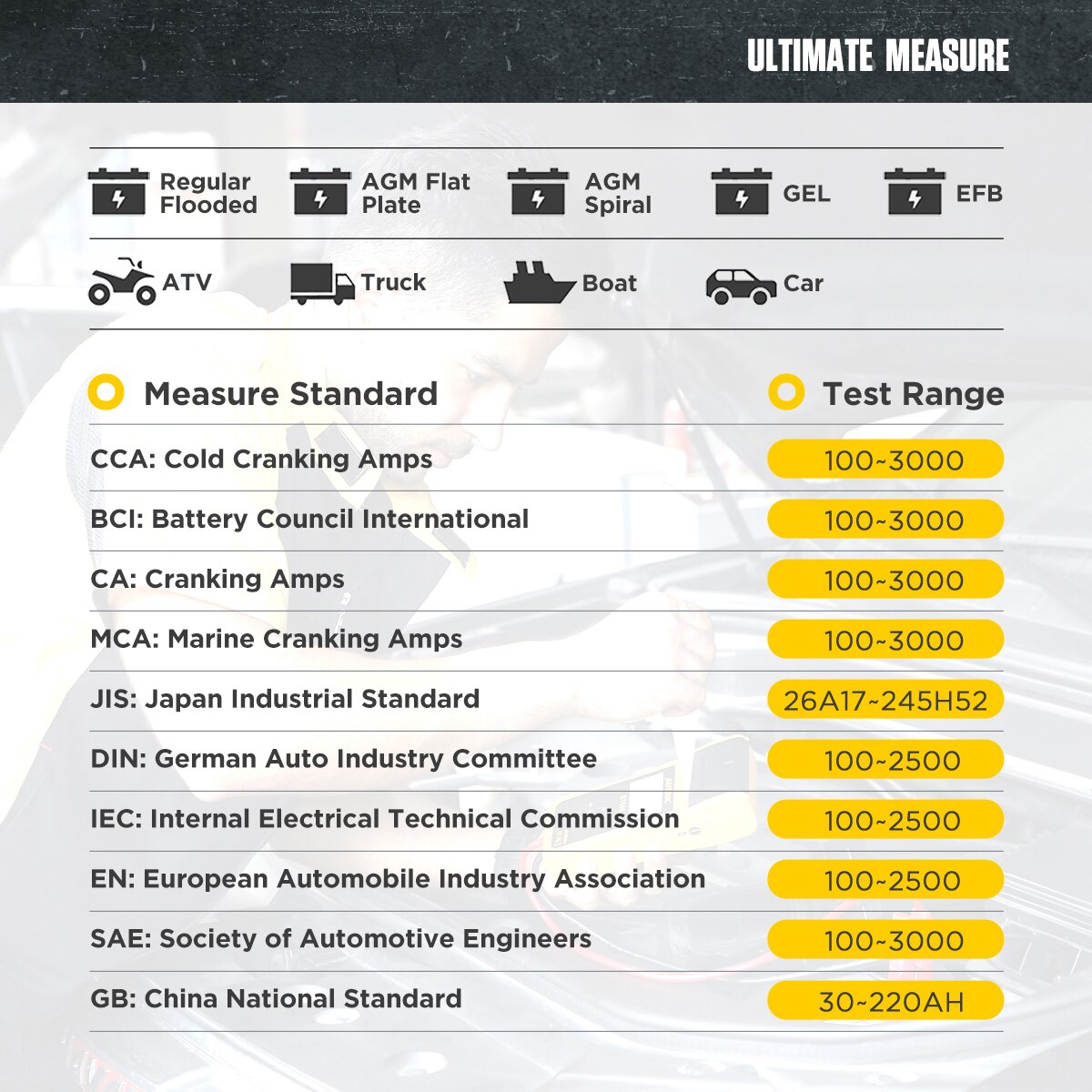 • Los estándares de prueba incluyen la mayoría de los estándares de batería en el mundo, CCA IEC EN DIN JIS y OTRAS ESPECIES. Probador profesional de rango súper amplio clasificado de 100 a 3000 CCA. Compatible con automóviles, motocicletas, camiones, vehículos recreativos, vehículos todo terreno, vehículos utilitarios deportivos, barcos, yates, cortacéspedes e incluso carritos de golf. Con Polarity Reverse Protection, tanto la batería como el dispositivo no se dañarán.