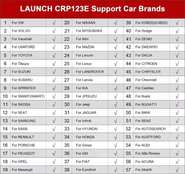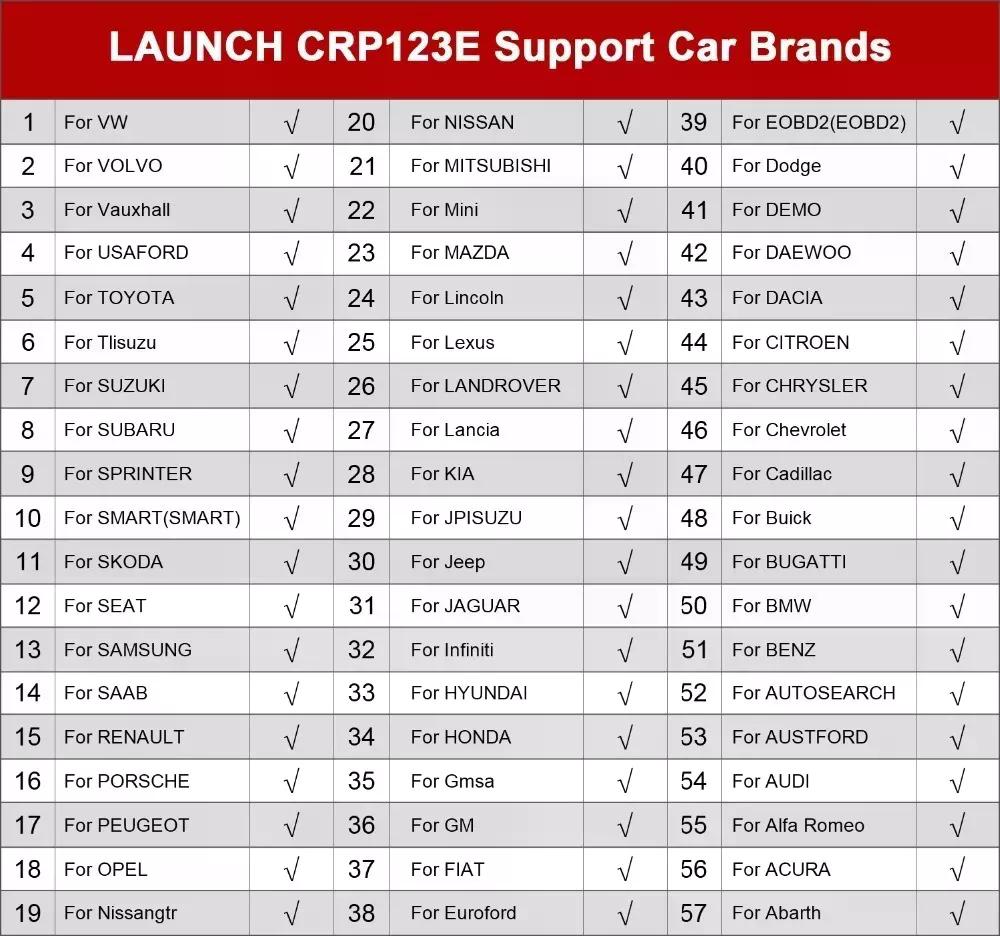 * PRODUCTO DISPONIBLE ENTREGA INMEDIATA *——————————————————————————————Scanner launch CRP 123ESoporta los cuatro sistemas: motor, transmisión (caja), ABS y airbagEl Launch CRP123E posee una pantalla TFT de gran resolución de 5 pulgadas y sistema operativo Android 7.0, además, posee una batería de litio recargable de 4000 mAh. También cuenta con 8 GB ROM, 1 GB de RAM, lo que lo hace un equipo de diagnóstico de respuesta rápida.Cuenta con actualización de por vida para todas sus marcas compatibles y a diferencia de los otros modelos, este se actualiza de forma sencilla con un solo clic una vez que se haya conectado a una red Wifi.Características del escáner automotriz Launch CRP123ESoporta los cuatro sistemas: motor, transmisión (caja), ABS y airbagAdmite 10 modos OBD II, incluyendo EVAP, sensor O2, dirección I/M, estado MIL, información VIN y másVisualización en tiempo real de la batería del Automóvil con gráficos incluidosTecnología inteligente AutoVIN para identificar de forma rápida y precisa los Automóvils con un solo botónMenú multi-idioma (incluye el lenguaje español)Actualizaciones del software gratuitas durante la vida del equipo a través de Wifi3 funciones especiales de mantenimiento para su Automóvil:-Restablecimiento del cuerpo de aceleración-Reinicio de servicio de aceite de motor-Restablecimiento del ángulo de dirección (SAS)Cobertura de marcas de Automóvils del escáner automotriz Launch CRP123E:Abarth, Acura, Alfa Romeo, Audi, BENTLEY, BMW, BUGATTI, Buick, Cadillac, Chevrolet, Chrysler, Citroën, DACIA, Dodge, Daewoo, Euroford, Fiat, Ford, GM, Opel (South Africa), Holden (Australia), Honda, Hyundai, Infiniti, Isuzu, JAGUAR, Jeep, Kia, LAMBORGHINI, Lancia, Lexus, Lincoln, Landrover, Mazda, Mercedes, Mini, Mitsubishi, Nissan gtr, Nissan, Opel, Peugeot, Porsche, RENAULT SAMSUNG, Renault, Rolls-Royce, SAAB, Seat, Skoda, Smart, Sprinter, Subaru, Suzuki, isuzu, Toyota, Vauxhall, VW, VW_CV, Volvo¿Qué incluye la compra?1 Launch CRP123E1 Cable conector OBDII1 Cable cargador de 5V1 Estuche
