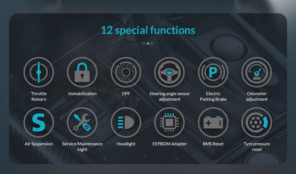 Sistema ABS, sistema de motor, sistema SAS, sistema TPMS, sistema IMMO, sistema de batería, sistema de servicio de aceite, sistema SRS, sistema DPF, sistema de aire acondicionado, sistema de transmisión, etc.